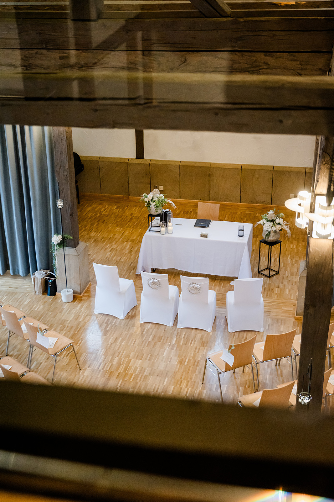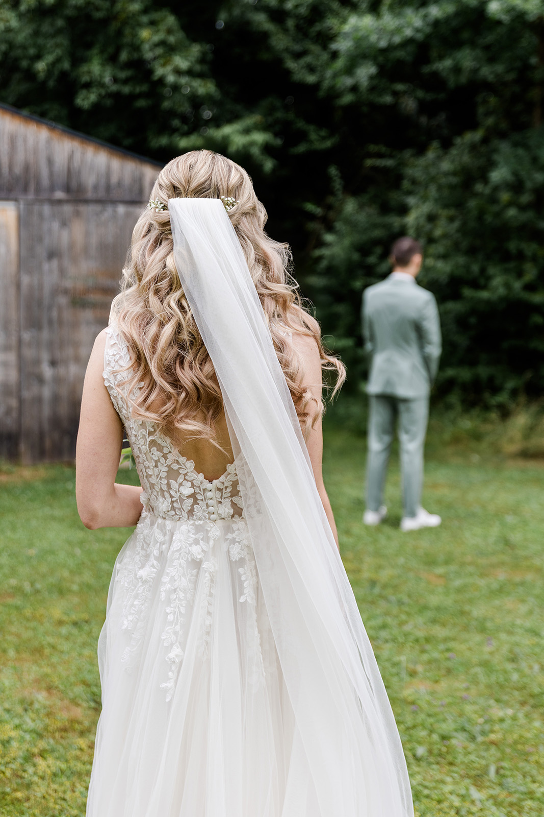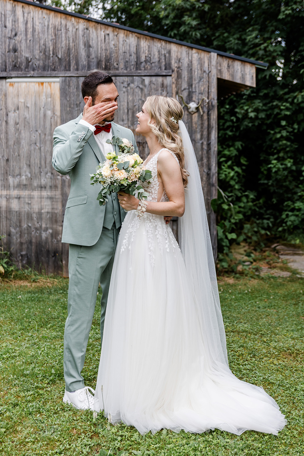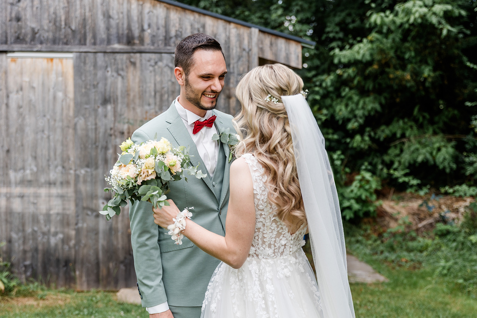 Alles lief auf diesen einen Moment hinaus – ihren First Look. Ganz spontan entstand er im Nachbarsgarten und hätte passender kaum sein können. Gemeinsam ging es anschließend weiter zur standesamtlichen Trauung in Schönaich, wo bereits Familie und Freunde warteten und Alicia von ihrem Vater hereingeführt wurde. Nach einem fröhlichen Auszug wurde gratuliert, angestoßen und gelacht, bevor es zur Feierlocation nach Böblingen weiterging.