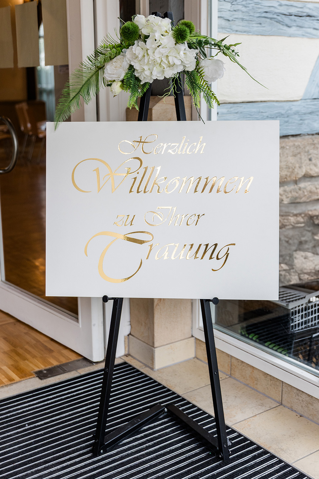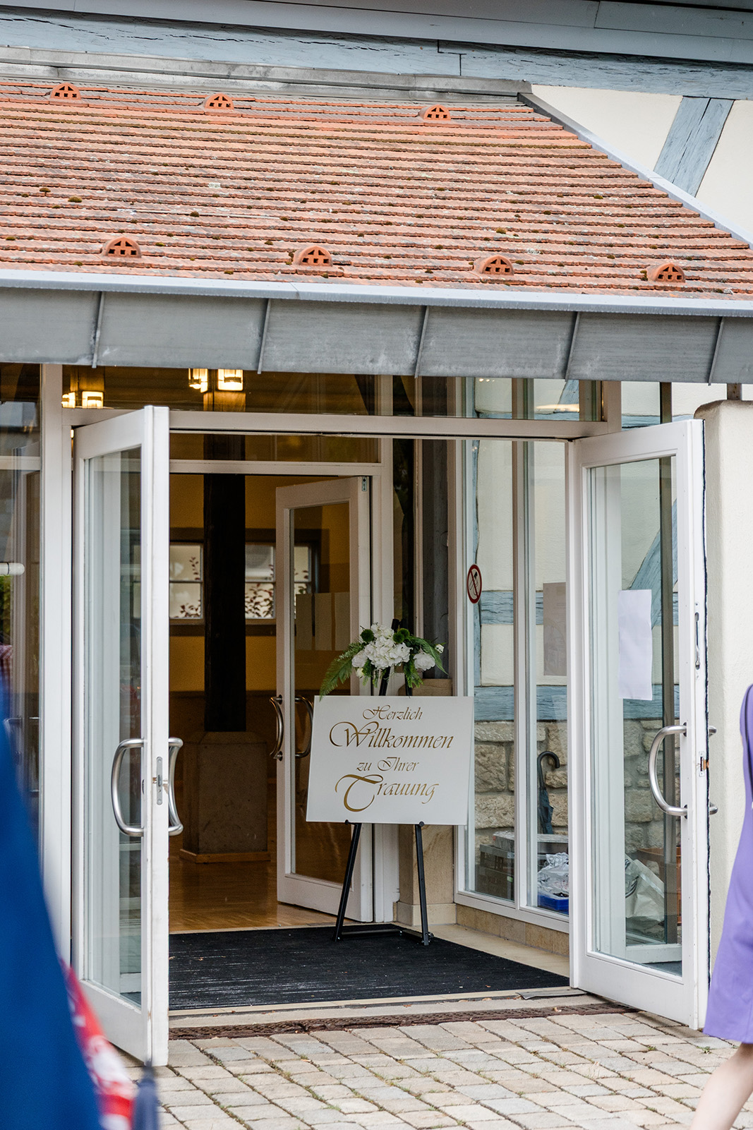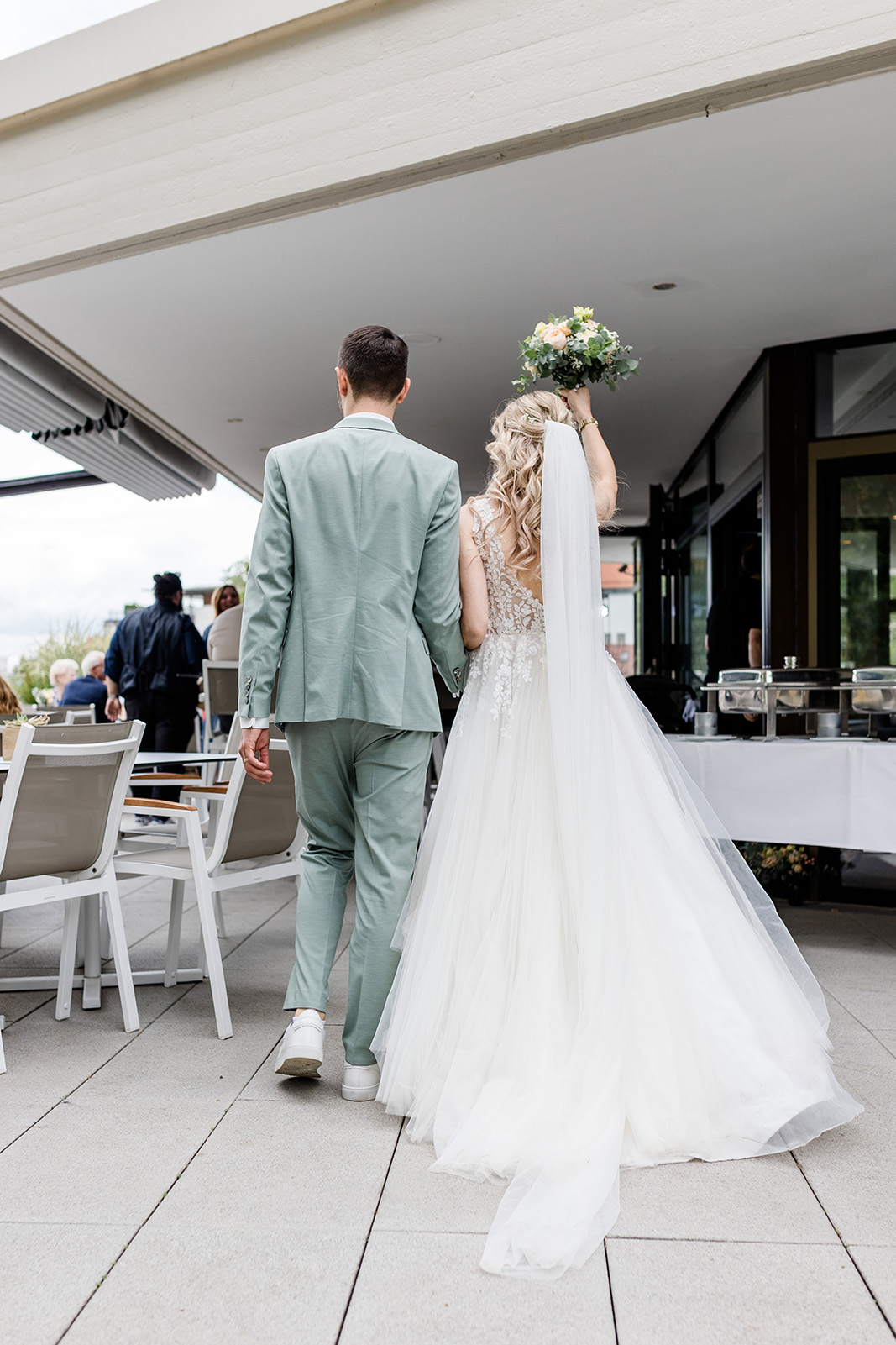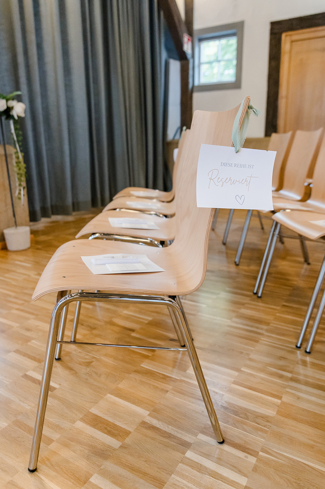 Alles lief auf diesen einen Moment hinaus – ihren First Look. Ganz spontan entstand er im Nachbarsgarten und hätte passender kaum sein können. Gemeinsam ging es anschließend weiter zur standesamtlichen Trauung in Schönaich, wo bereits Familie und Freunde warteten und Alicia von ihrem Vater hereingeführt wurde. Nach einem fröhlichen Auszug wurde gratuliert, angestoßen und gelacht, bevor es zur Feierlocation nach Böblingen weiterging.