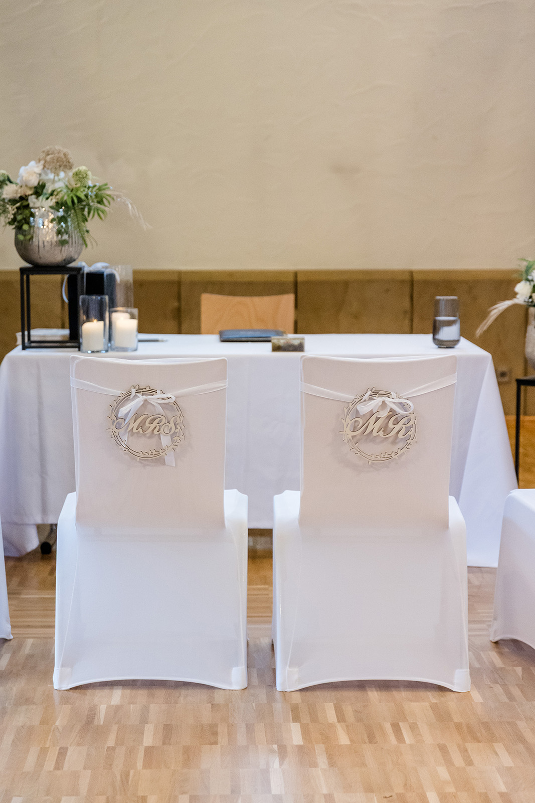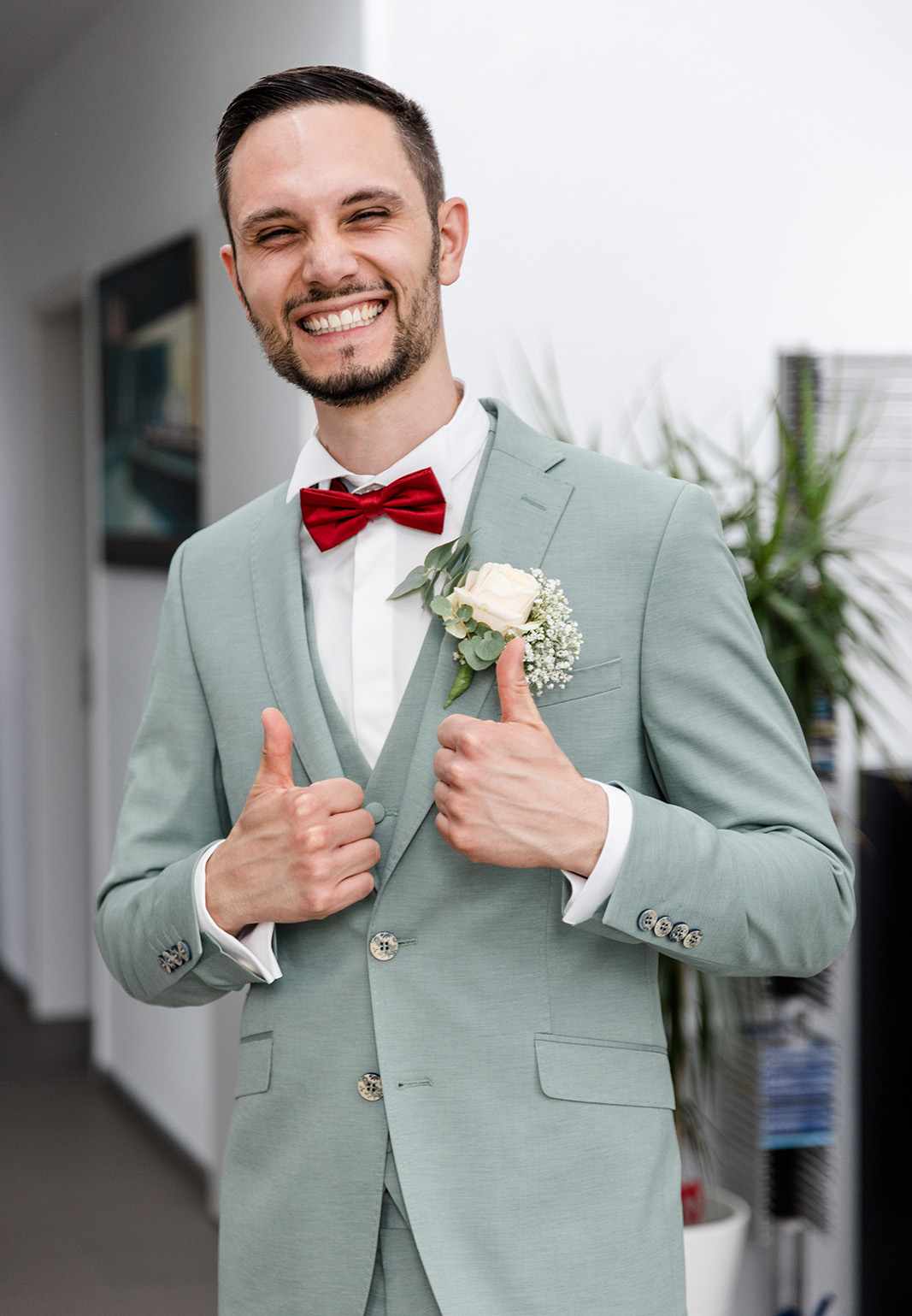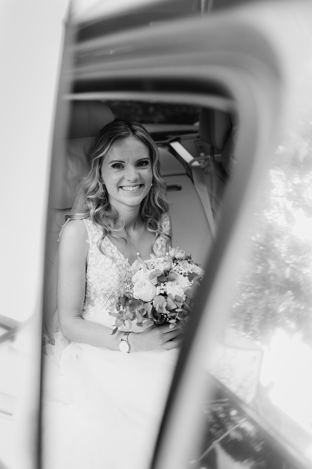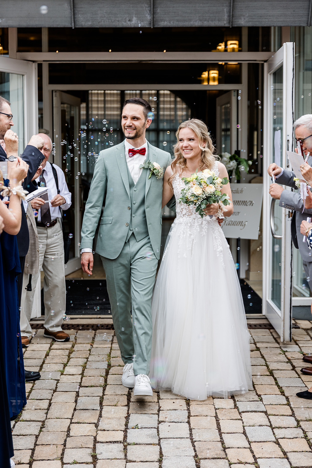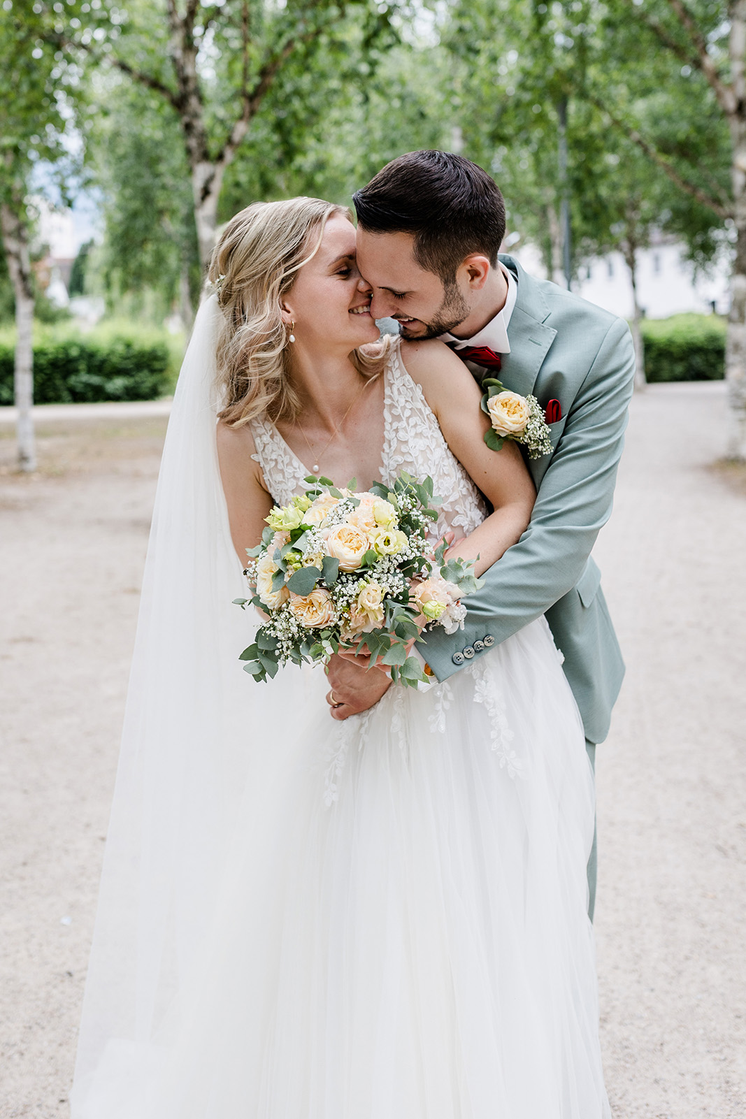 Alles lief auf diesen einen Moment hinaus – ihren First Look. Ganz spontan entstand er im Nachbarsgarten und hätte passender kaum sein können. Gemeinsam ging es anschließend weiter zur standesamtlichen Trauung in Schönaich, wo bereits Familie und Freunde warteten und Alicia von ihrem Vater hereingeführt wurde. Nach einem fröhlichen Auszug wurde gratuliert, angestoßen und gelacht, bevor es zur Feierlocation nach Böblingen weiterging.