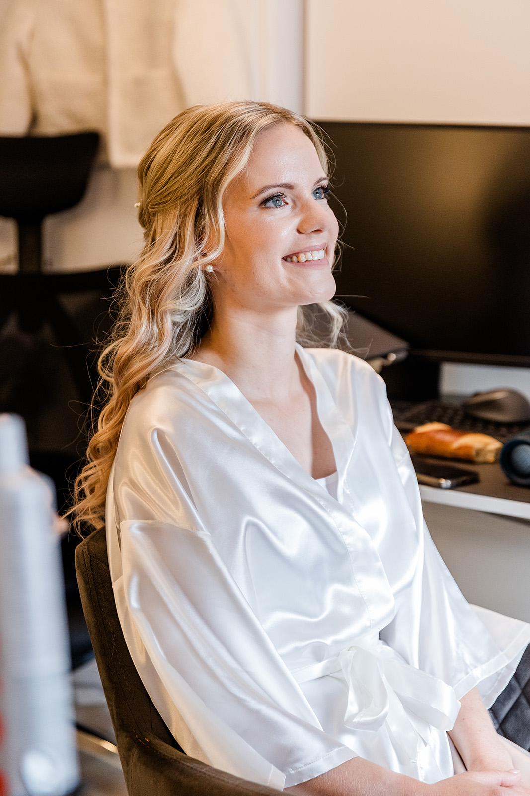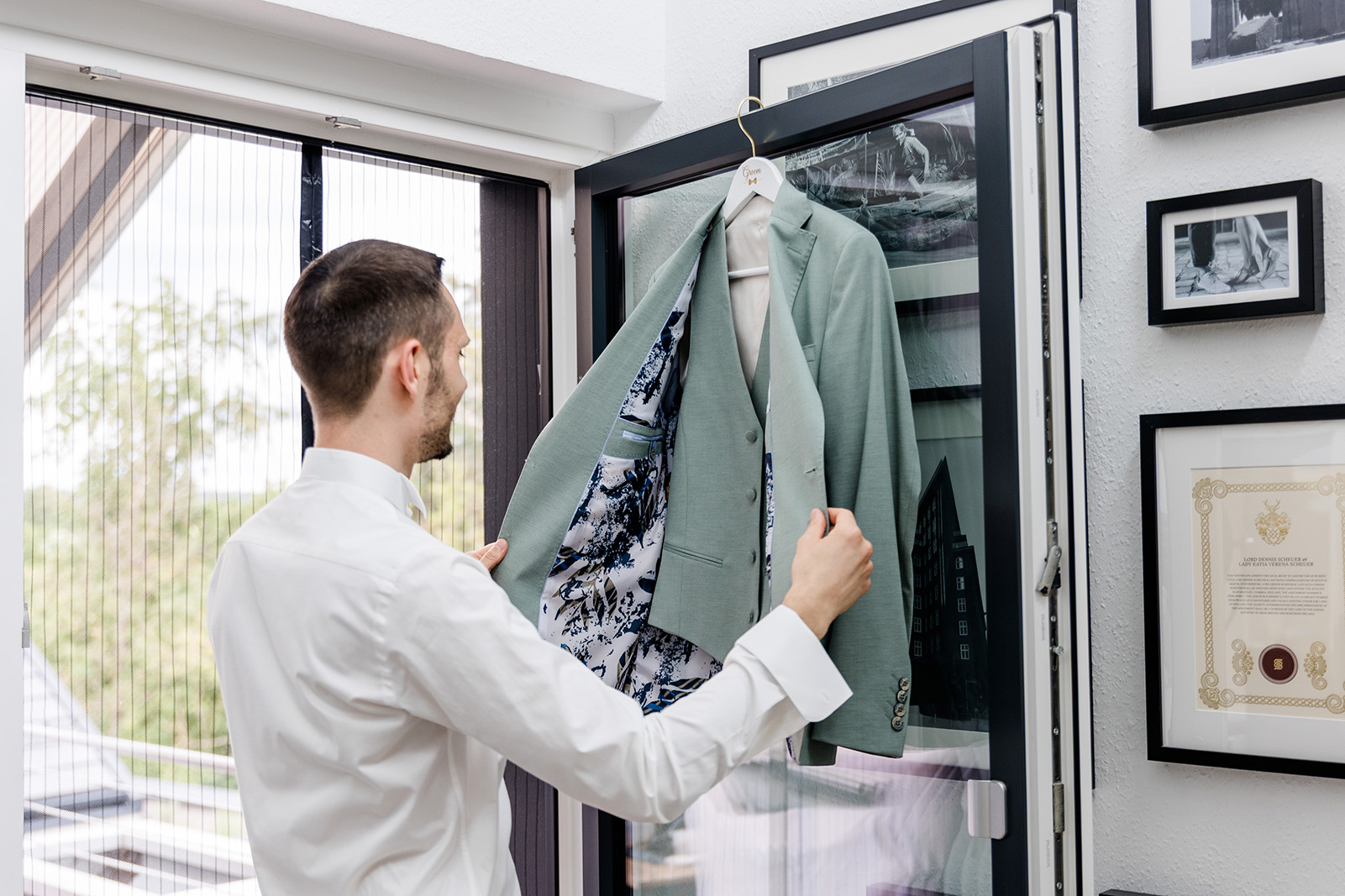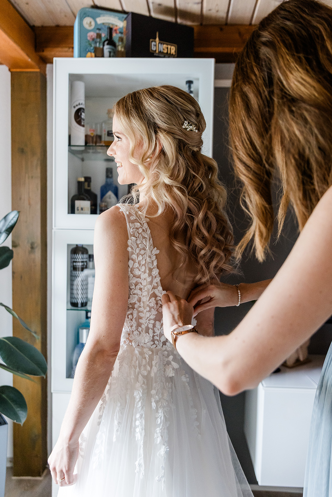Alicia & Sven durfte ich vom Getting Ready zuhause bis zum Anschnitt ihrer Hochzeitstorte am Abend begleiten. Der Tag begann dabei ganz ruhig: Alicia machte sich gemeinsam mit ihrer Trauzeugin und Mama fertig, während Sven sich nur wenige Häuser weiter mit seinem Trauzeugen vorbereitete.
