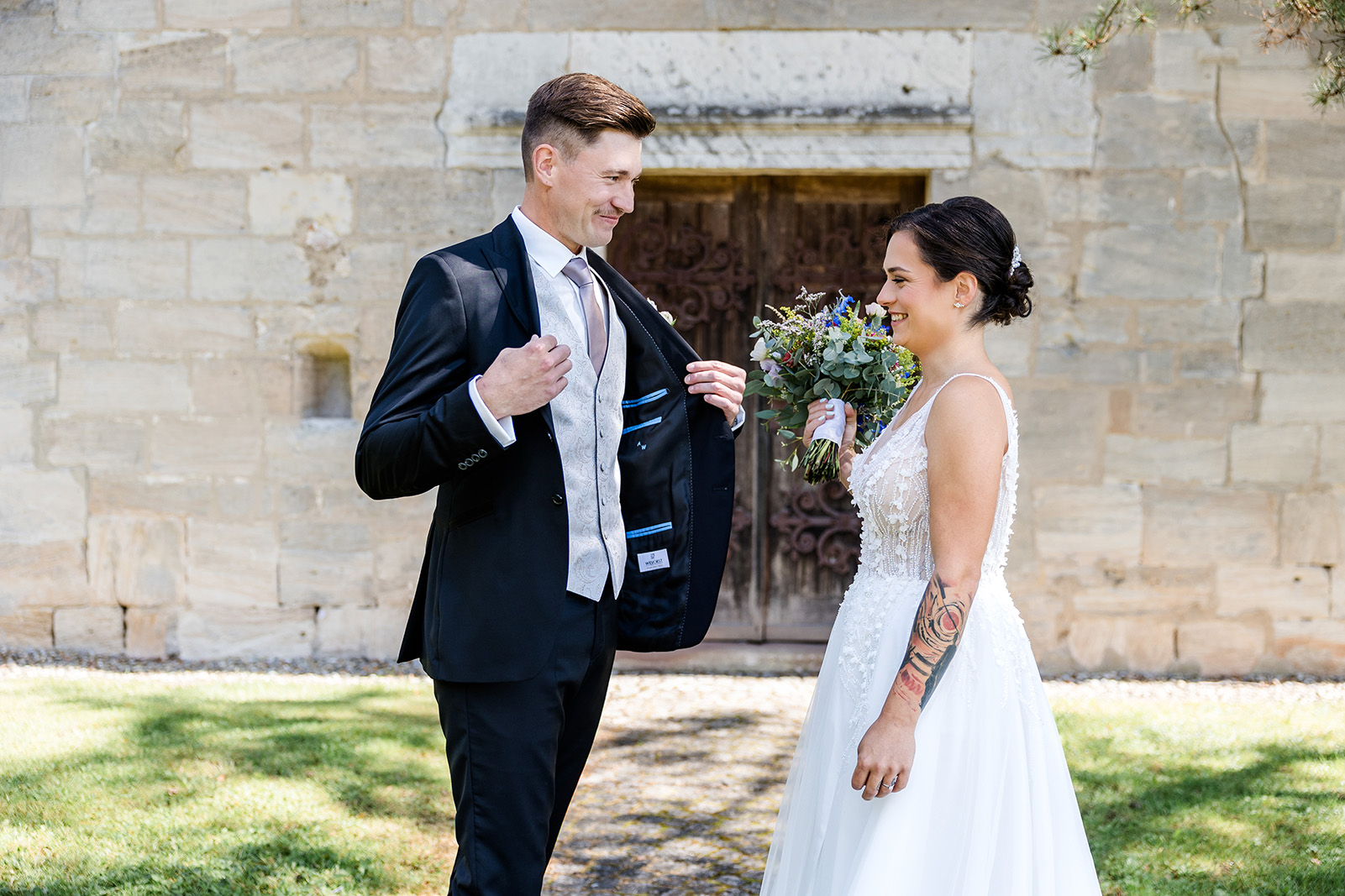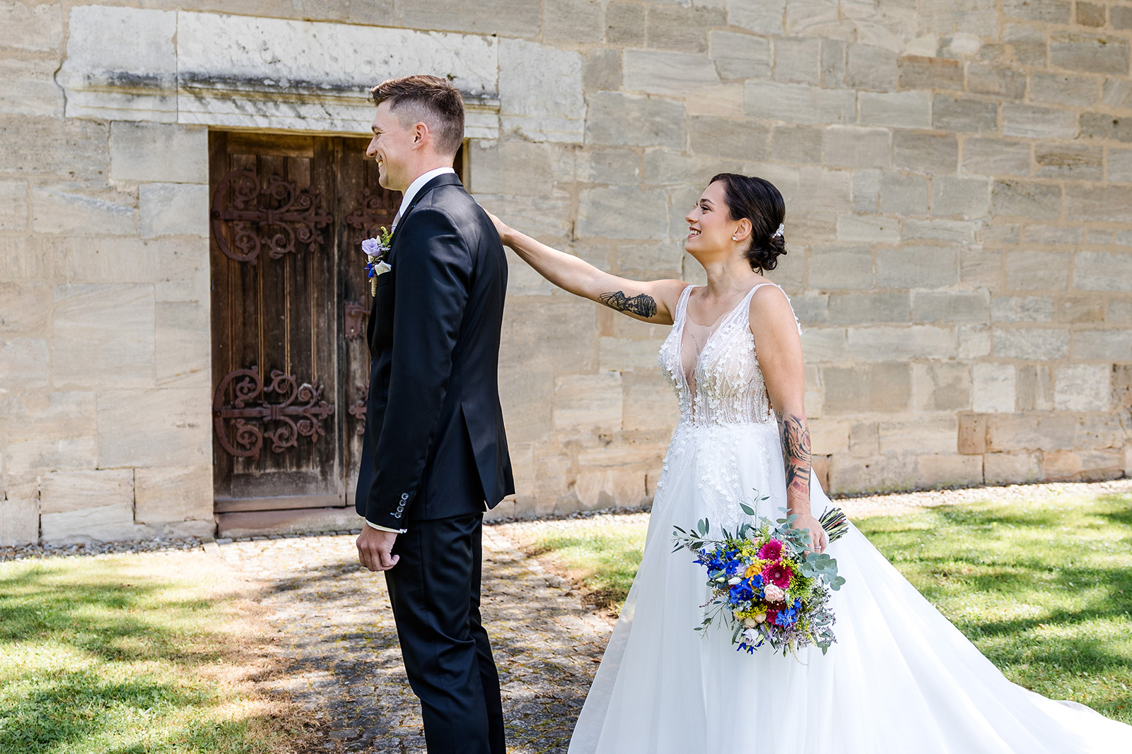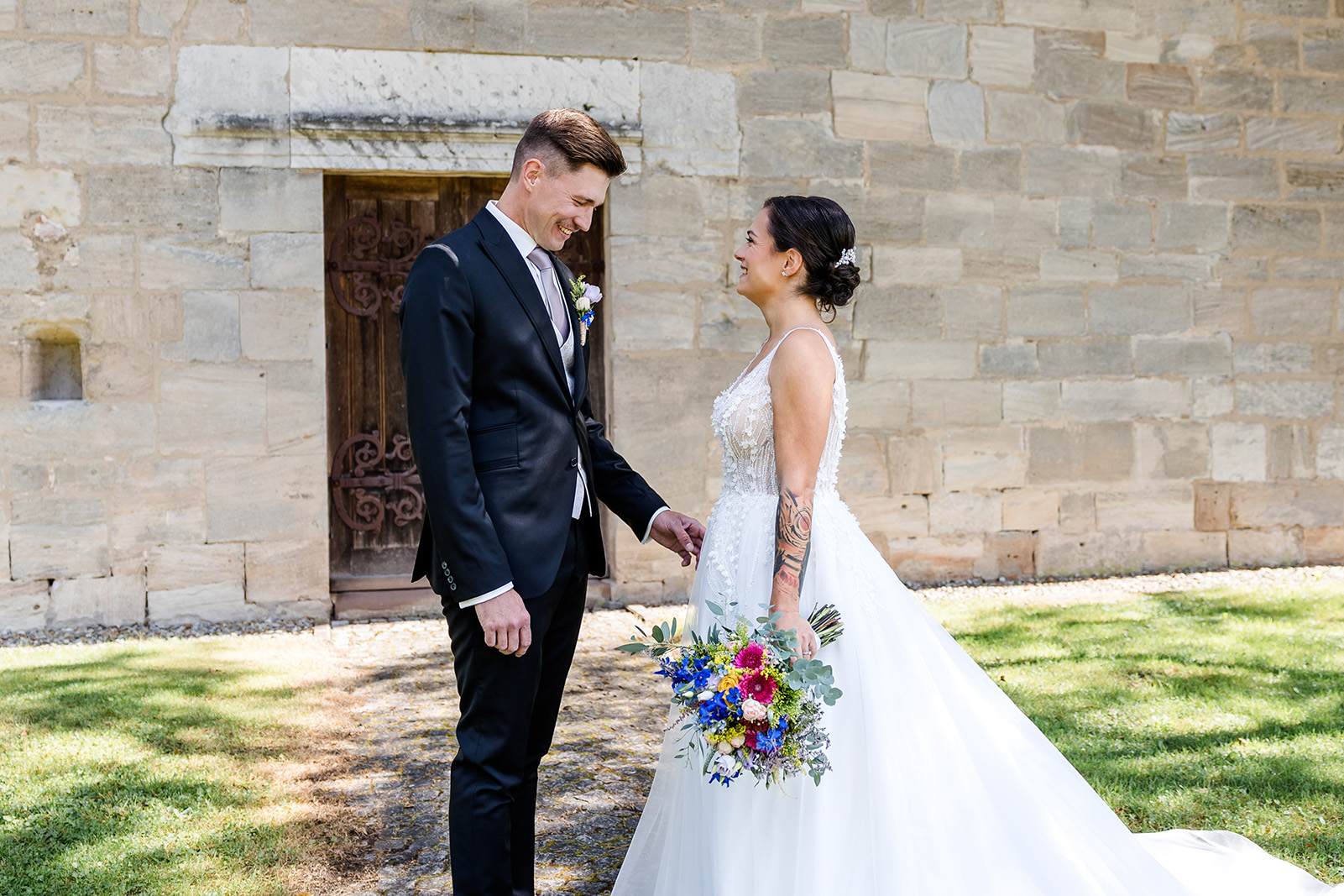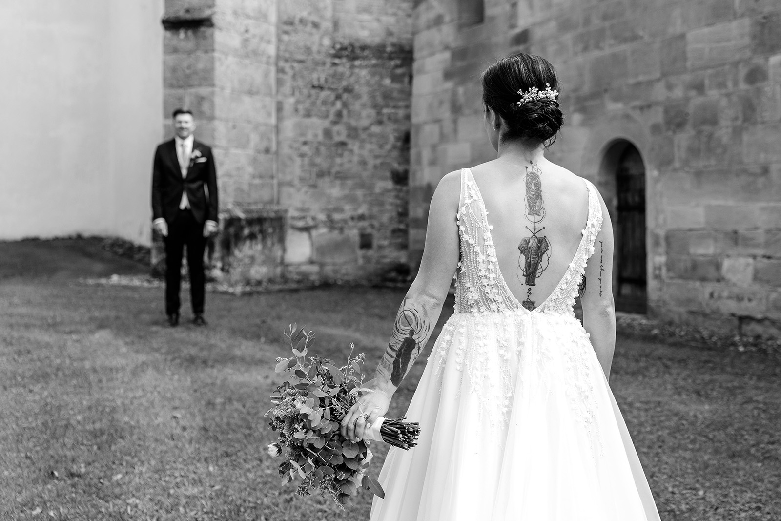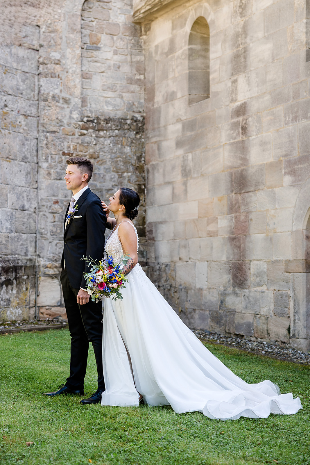 Leonie und Andre haben mich an ihrem besonderen Tag im Kloster Lorch von Anfang an mitgenommen – ein Ort voller Geschichte, Ruhe und einer besonderen Stimmung. Wir starteten mit ihrem First Look, dem ersten aufeinander Treffen des Tages. Es lag eine kleine Aufregung und ganz viel Vorfreude in der Luft.