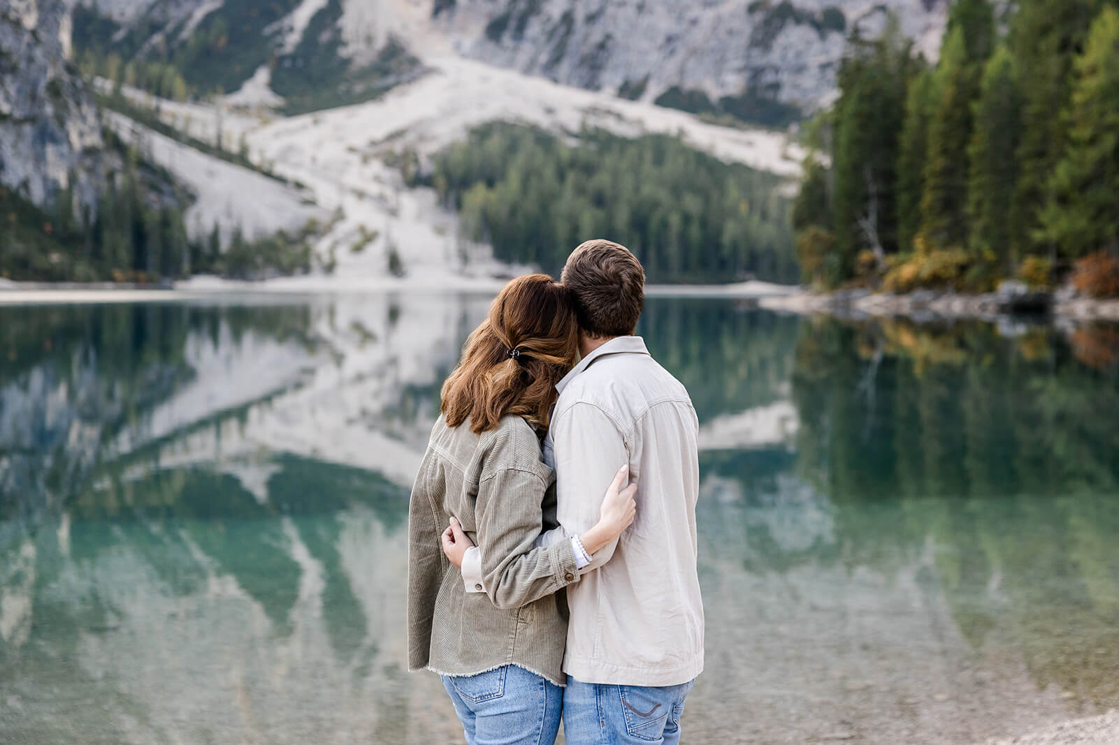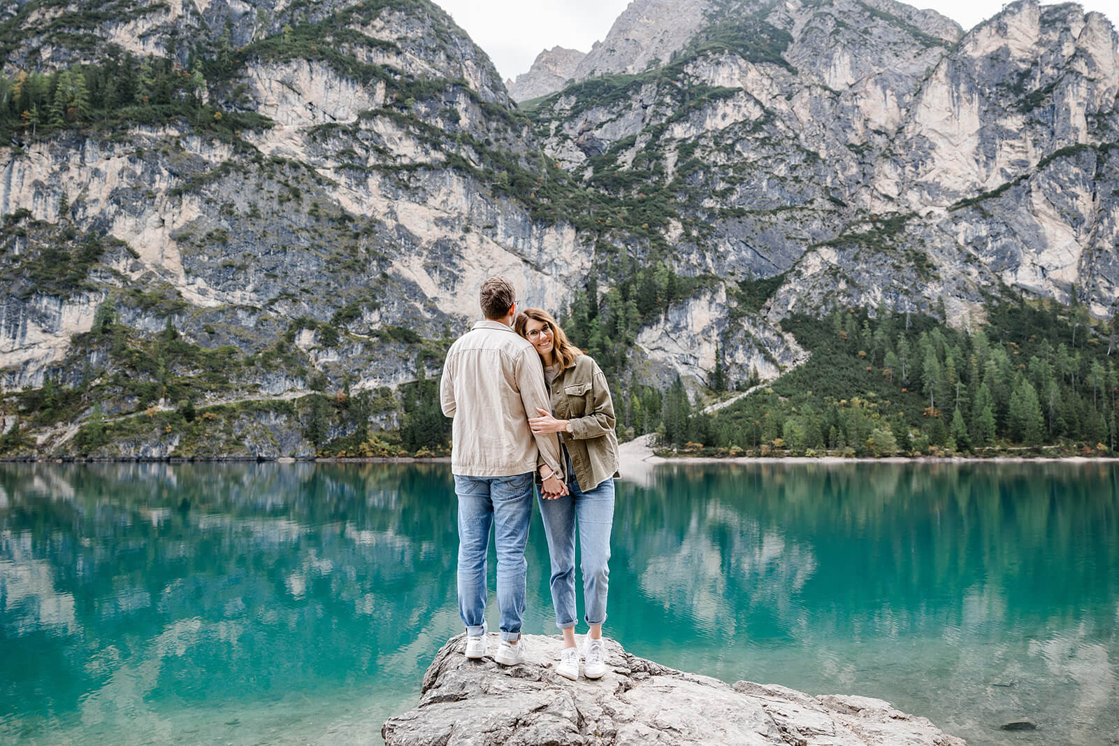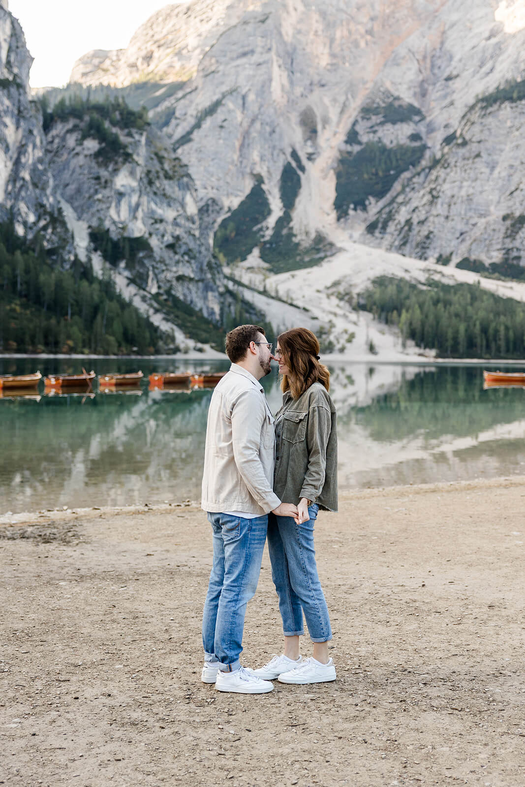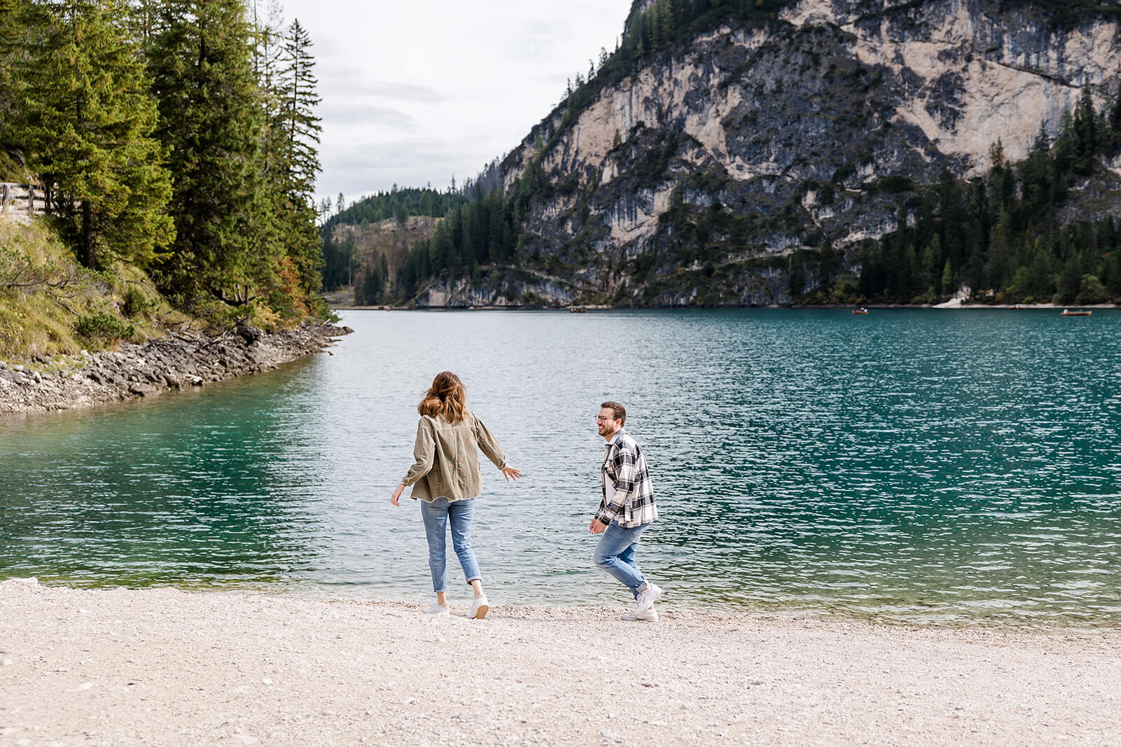 Mit Lara und Jonas entstand dieses Paarshooting recht spontan – und zwar am wunderschönen Pragser Wildsee in Südtirol, umgeben von beeindruckender Berg- und Seekulisse.