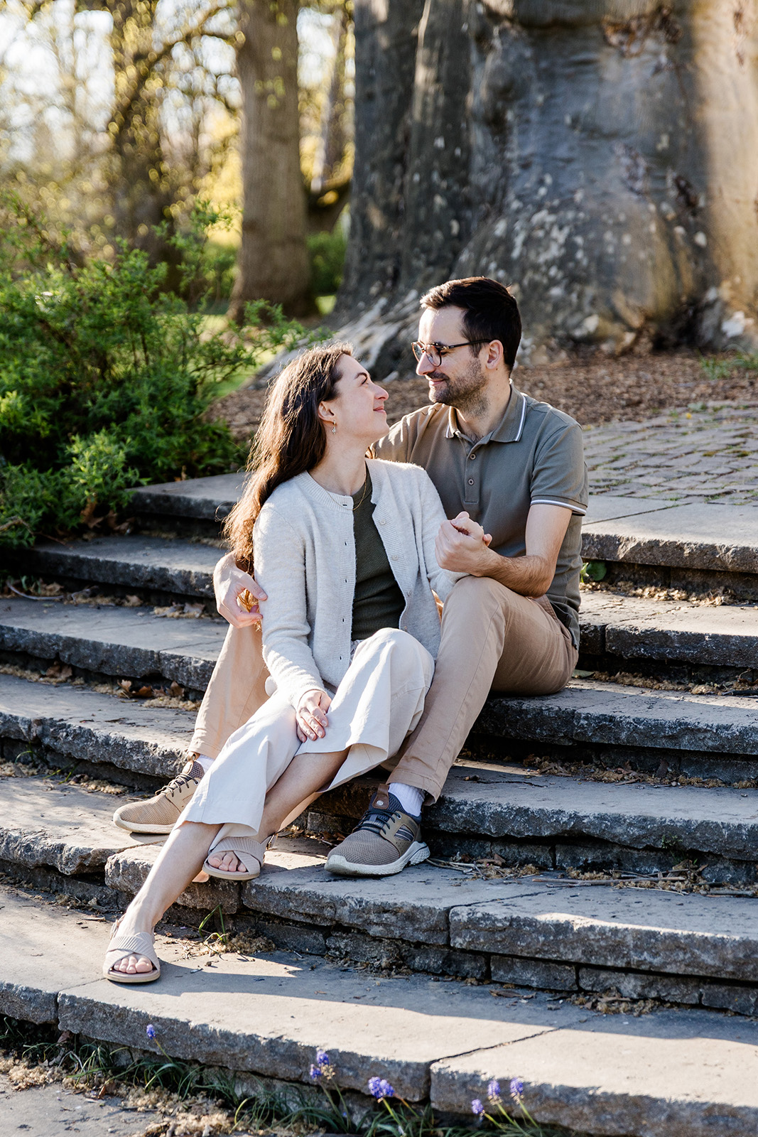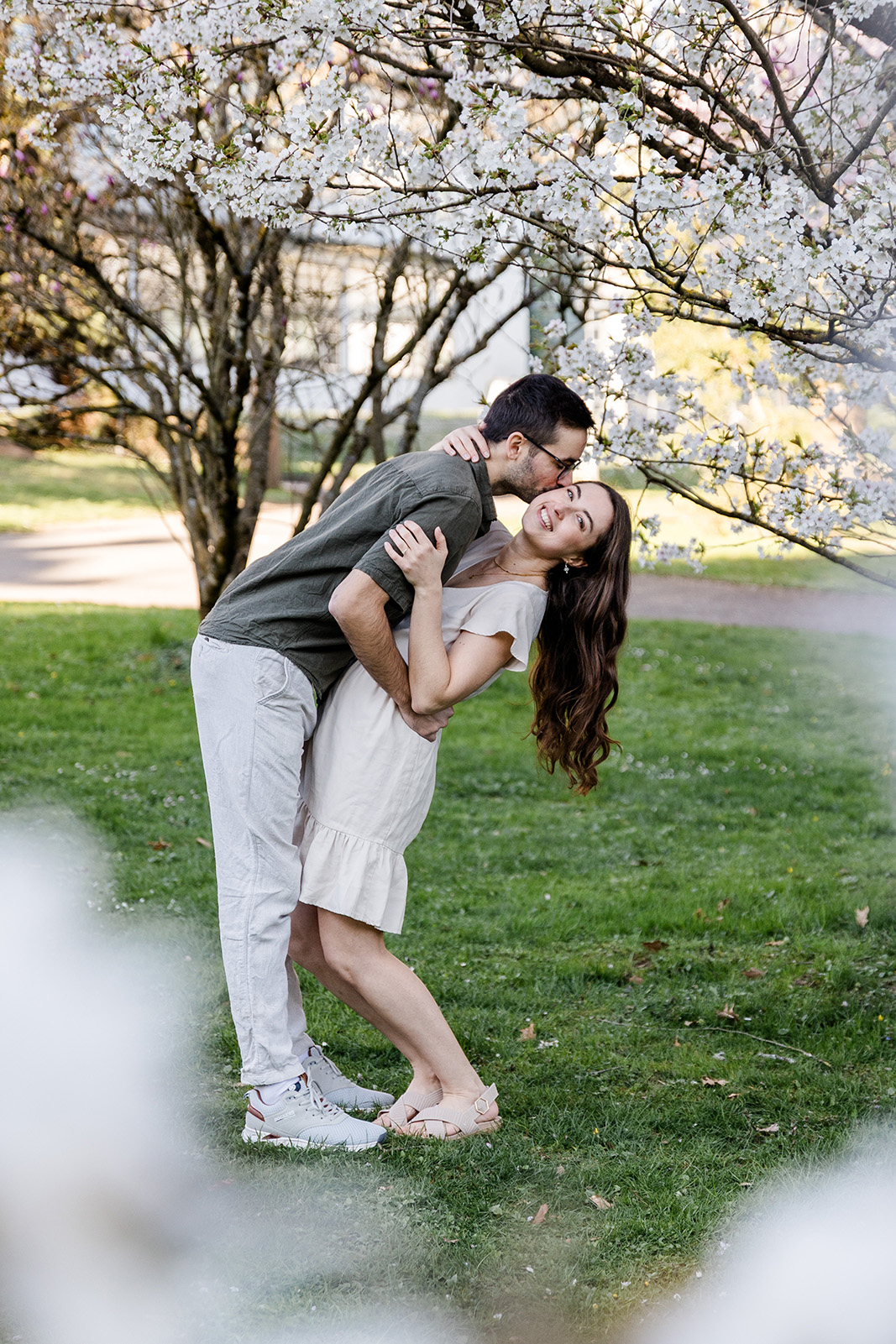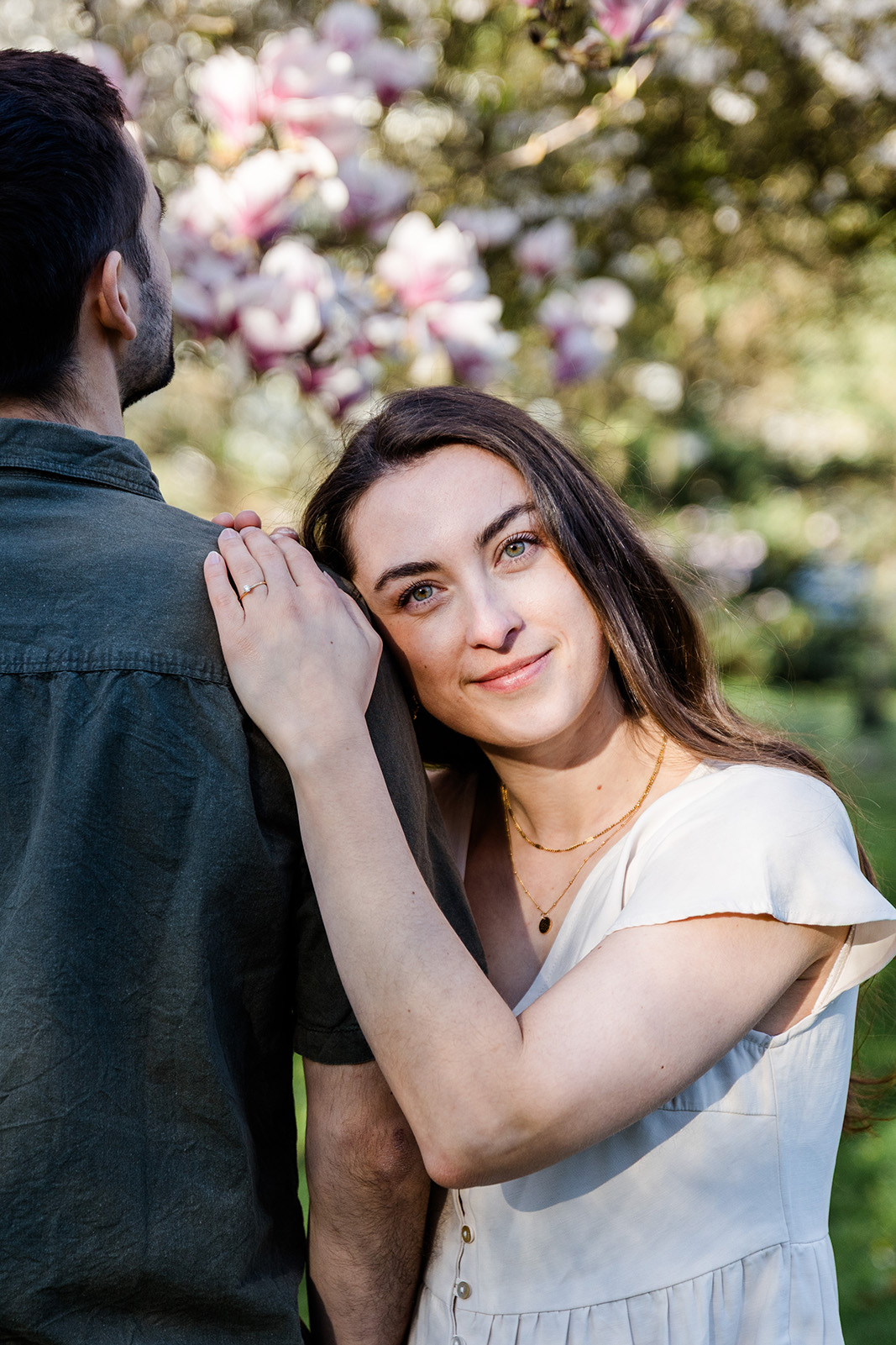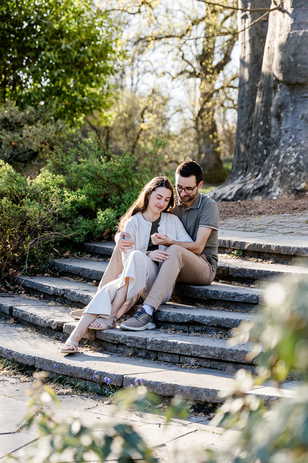 Im Frühling durfte ich die beiden im Hohenheimer Park in Stuttgart-Plieningen zu ihrem Verlobungsshooting treffen. Zwischen blühenden Magnolien und einem Teppich aus Gänseblümchen entstand eine ruhige, romantische Stimmung, die perfekt zu ihnen passte.